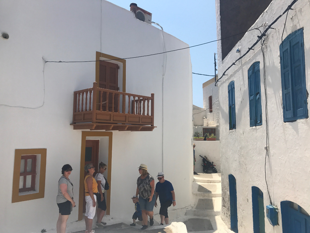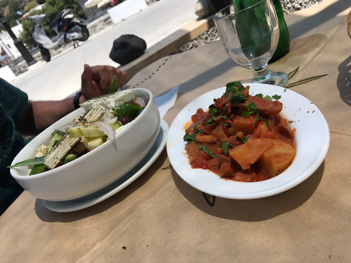 Danach durften wir das kleine Dorf Nikia besuchen, welches mit den engen Gassen, weißen Häußern und blauen Dächern einfach zum Verlieben ist. Von dort aus ging es wieder zurück nach Mandraki um unseren Hunger zu stillen. Wir machten es uns in dem kleinen aber feinen Restaurant Bacareto „In Busa“ gemütlich und bestellten ein paar Kleinigkeiten (u. a. griechischen Salat, Oktopus, etc.) zum Essen und zu Trinken. Das Essen war köstlich und die Mitarbeiter super nett :).